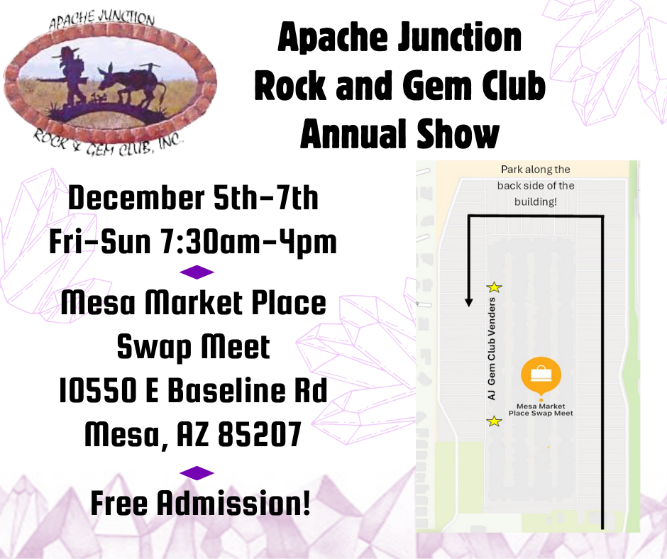 The Apache Junction Rock and Gem Club will be hosting a monthly show at the club. This event is FREE and open to everyone to come and visit!